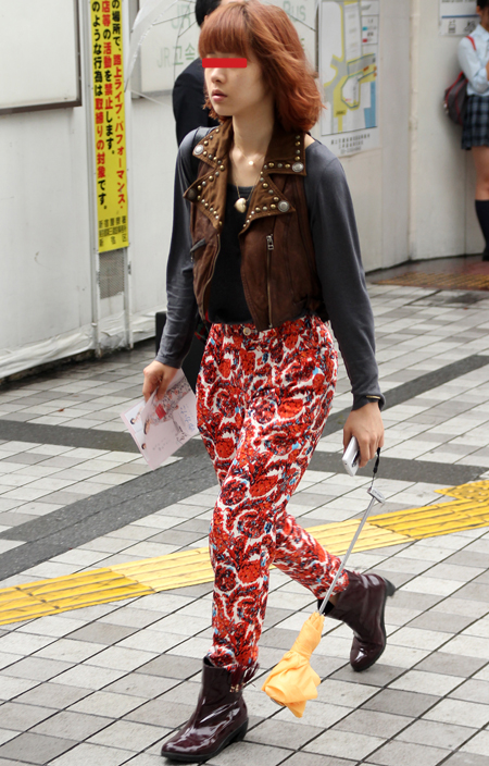 地色がグラデーション・カラーの柄パンツ。厚底靴のバリエーショ...