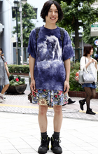 オールインワンの上からトップスを重ねた着こなし。柄パンツは古...