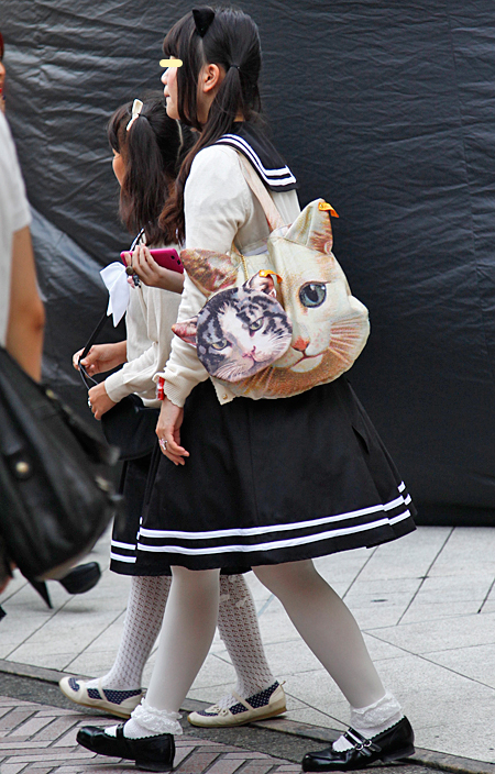 セーラー服のコスプレファッションの2人組はネコの顔をかたどっ...