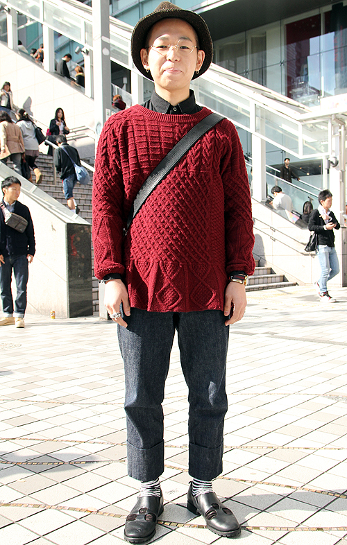 いちばん上に見える部分が(身頃や袖部分など)がニット素材になっているスタイルの男女すべて。色や柄、デザインは問わない。