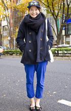 ビッグシルエットのジャケット+スヌードの組み合わせ。首周りを...