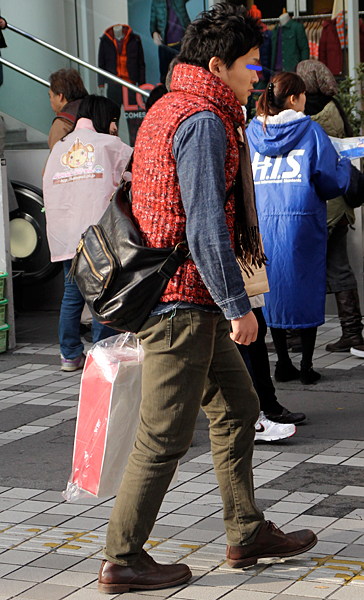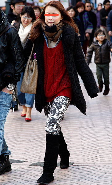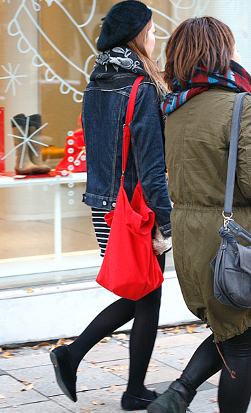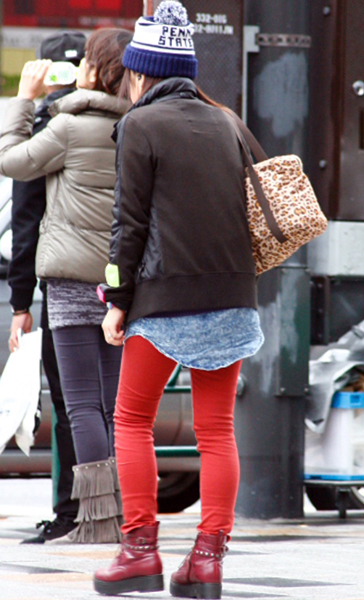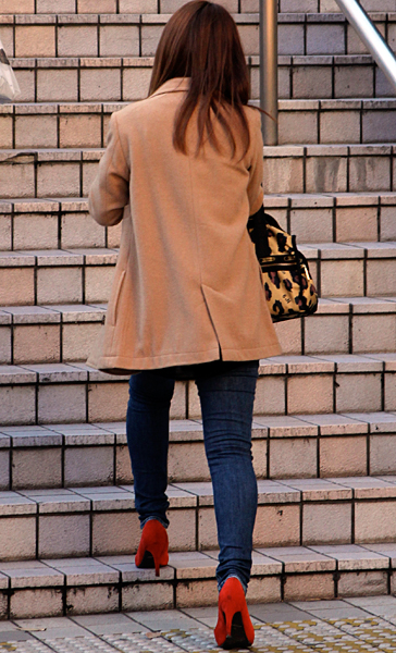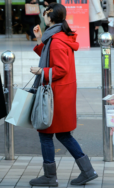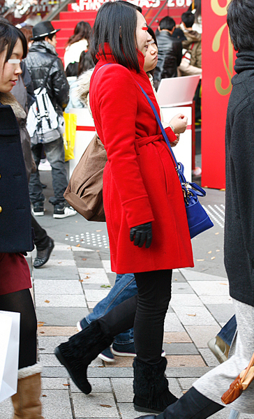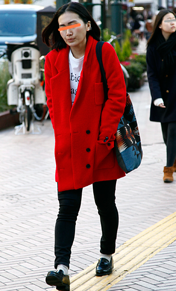 12月に入り、ぐっと増えたのが赤いコート。+黒いスキニーパン...