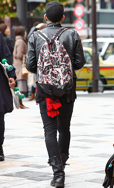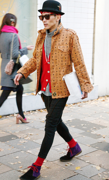 個性の強い「MCM」のレザージャケットに赤をバランス良く配置...