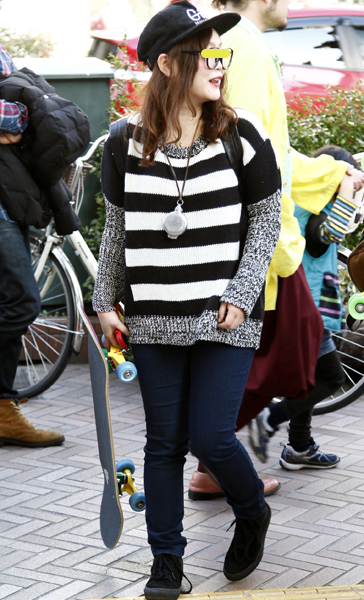 街中でもかなり増えているスケボー女子は、夏に被っていたニット...