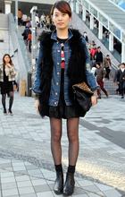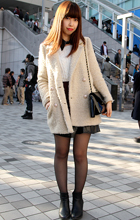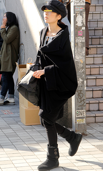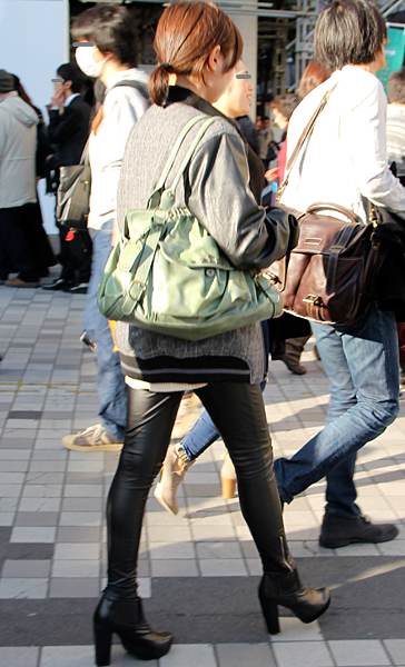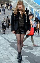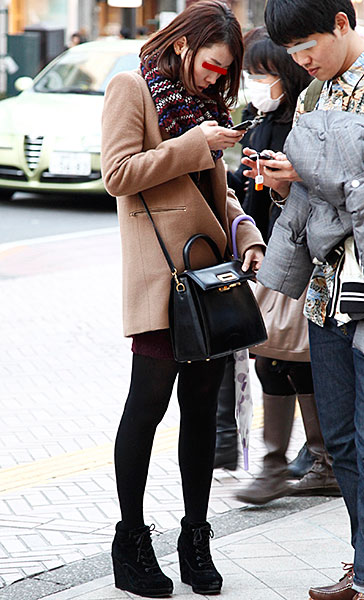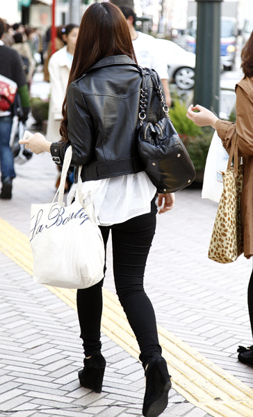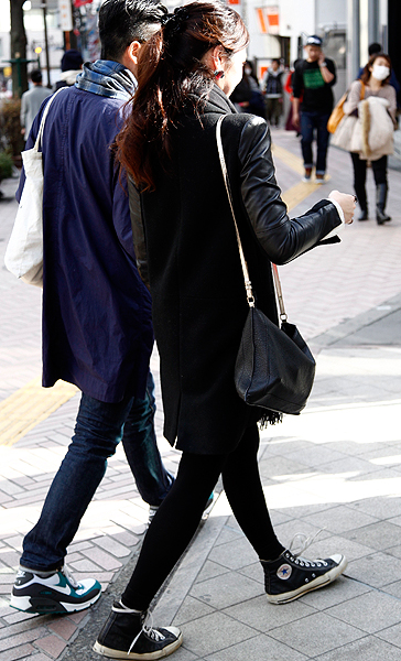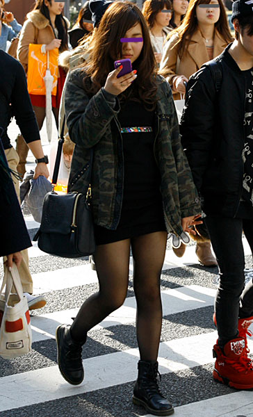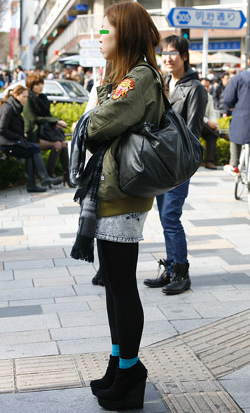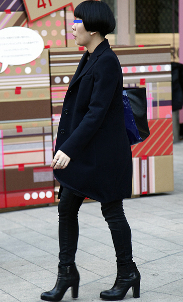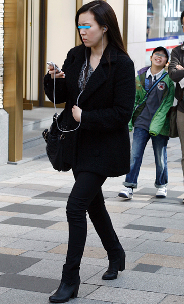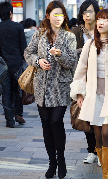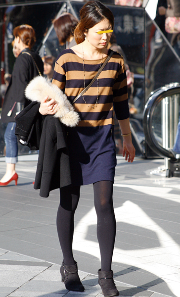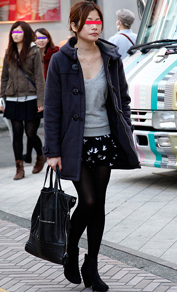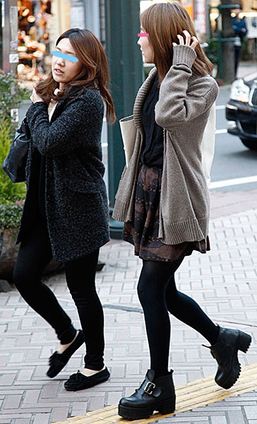 黒いストッキングまたはタイツ、レギンス、スキニーパンツなどで足にぴたっと密着した脚が演出されている女性すべて。若干の柄があっても可。