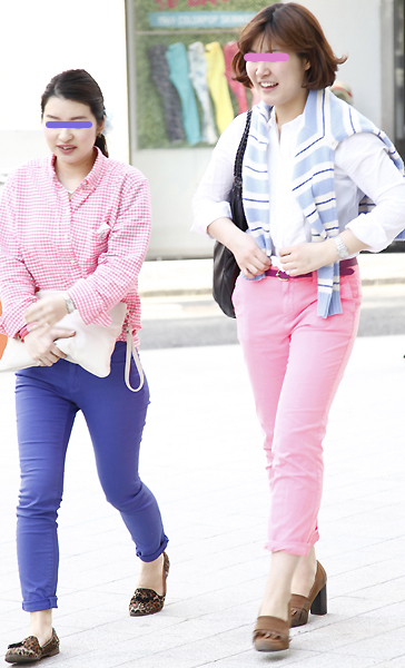 コンサバ系にはきれいな色のスキニーパンツが人気。+ヒールやホ...