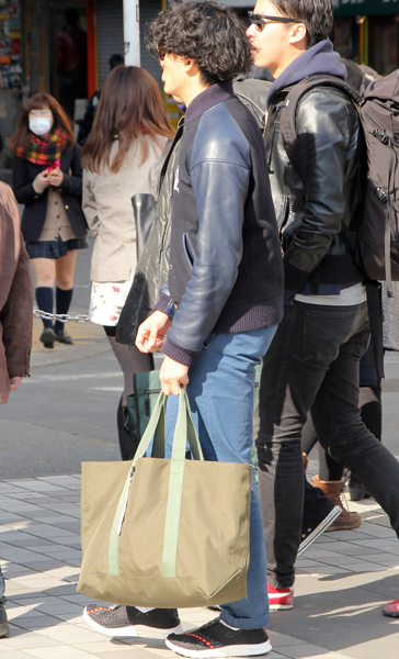 真っ赤なエコバッグが目を引いた彼。ショップコートにソックスチ...