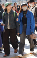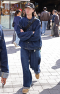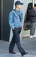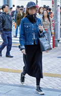 デニムのセットアップコーディネートも目についた。キャップは無...