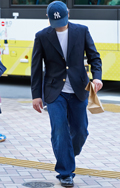 金ボタンの紺ブレに白Tやベースボールキャップを合わせた、絵に...