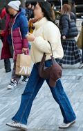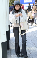 ショート丈アウターにフレアジーンズ、のカジュアルな着こなしだ...