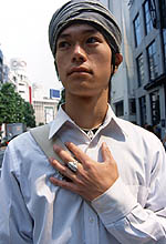 巻きものっぽく見えるけど、実はターバン風の帽子なんです。アタマ巻きものは去年の春くらいから『MEN'SNON-NO』で見るようになったんです。でも、それ以前から街ではちょくちょく見かけていて、「キレイめでかちっとした格好に合わせたらハズす感じで面白いな」と思って、買いました。トップスがかっちりしていたらパンツはダルイ感じのを合わせたり、というハズし感のあるコーディネートが好きですね。かぶりものはニット帽やキャスケット、ハットなど全部で5つ持ってて、巻きものはこれ1つだけ。真夏はちょっと暑いんで、真夏以外に巻いてます。