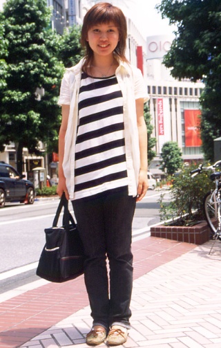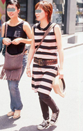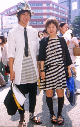 身頃全体に横方向(水平)の縞模様が施されたトップスを着用する男女すべて。