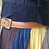 ちょっと太めで茶色のベルトが欲しくて買いました。ベルト通しは金のリボンを自分で付けました。パンツの時も、ベルト通しには通さず、少しトップスにかかるくらいの位置にベルトをしています。バックルをずらすのは、街の人やショップスタッフがやっているのを見て自然にやるようになりました。