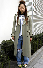 オフホワイトからベージュ、生成り、オリーブグリーン、カーキといった色合いをベースにしたトップスまたはボトムスを着用している女性すべて。柄の有無や素材は問わない。