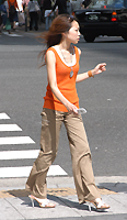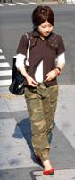 実際のストリートでもっとも多かったのは、ユルいカーゴパンツをガーリーなトップスと合わせた「アメカジ・ミックス」なスタイル。コットン100%で、極端に裾に向かって広がっているバギーやオンスの軽いデニムのサロペットなど「70年代ヒッピー風ファッション」が、今春夏のトレンドである「エスニック」とともに再々来。原宿のストリートでは、白や黒、ベージュなどモノトーンで全身をコーディネートした「モード・ミックス」なスタイルが目立った。