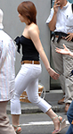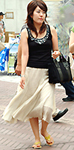 ■ トーキョーストリート系:黒のロングベストや超ショートボレロなど、極端なデザインでモノトーンのコーディネートが多い。ハーフ丈パンツや足首にストラップの付いたぺたんこシューズ+リュックが定番スタイル。ヘアの色も真っ黒か金髪と極端なンとラストが好き。