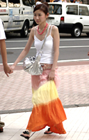 なかでも、エスニック調のティアード・ロングスカートはギャルの間で増殖! イエローからグリーン、またはピンクなどへのタイダイ風のグラデーションになっているのが特徴で、腰にアクセントとして幅広のメタリックなベルトをするのがアダルト層の定番スタイルとなっていた。