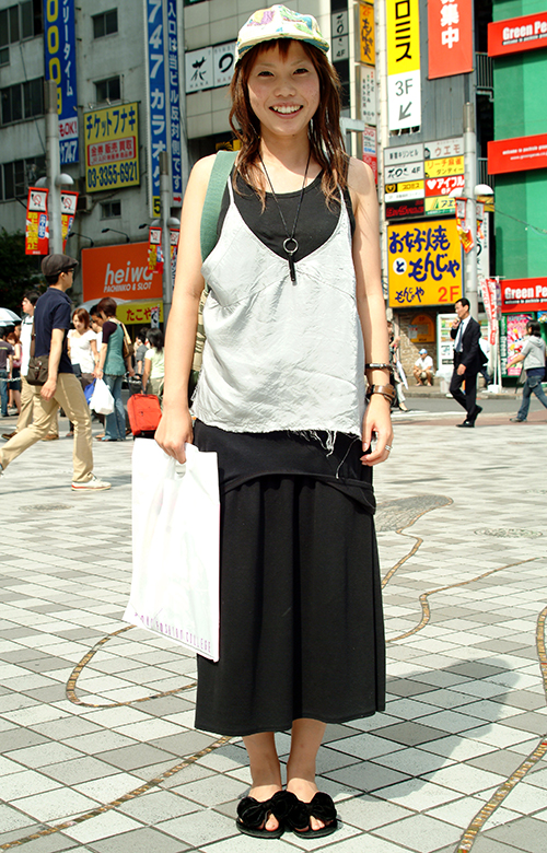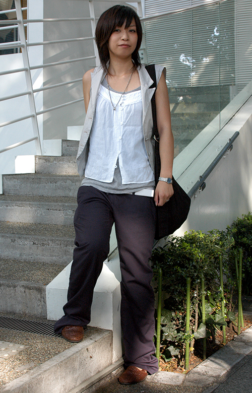 いちばん上に重ねているトップスに袖がないものすべて。色やデザインは問わない。