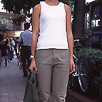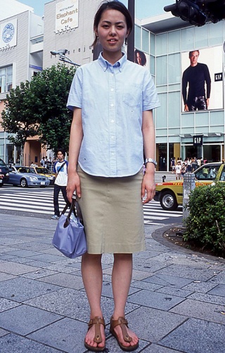 無地でベージュ系のスカートやパンツ、キュロットなどを着用する人。素材や丈は問わない。