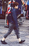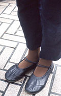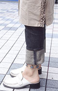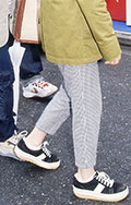 丈がくるぶし丈のクロップド・パンツ。ソックスやタイツ、ストッキングは履いていても履いていなくても可。色や柄、素材は問わない。