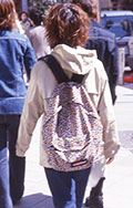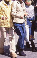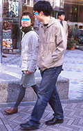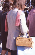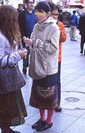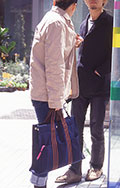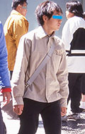 ベージュ色のトップスを着用していて、首に巻物をしている人。色やデザイン、素材は問わない。