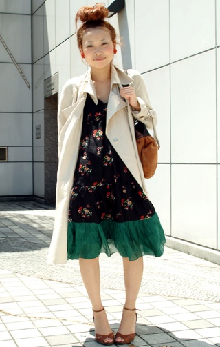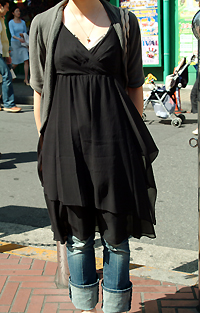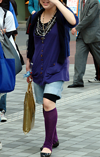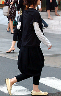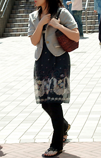 ワンピースの下にパンツやスパッツ、タイツやハイソックスなどのボトムス/レギンスを重ねて着用するスタイル。