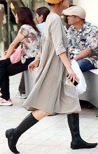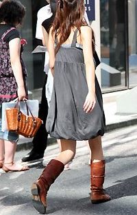 柔らかいドレープ感がジャージワンピの魅力。ブーツの履き口から...