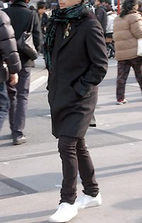 男性のスキニーパンツは黒が主流に。各地点共に全身黒のコーディ...