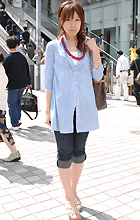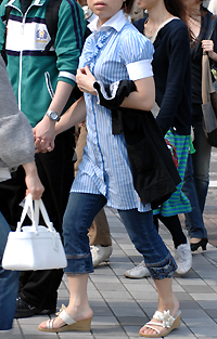シャツをジーンズにインしたスタイル。ギャルはシャツの胸元を大...