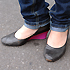 ウェッジソールのパンプスはジーナシスで紫の色が気に入って買いました。買ったとき、街では明るめの色を着ている人がいなかったので、白い目で見られていたんです。最近やっと街で浮かなくなりましたね。ボーダーのインナーは、定番でどんなアイテムとも合わせやすいと思い買いました。でも太って見えるので、1枚では着ないでインナー使いで取り入れています。