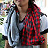 基本的に赤が好きで、差し色としてよく使います。今日は気分でモノトーンコーディネートにしたんですが、ポイントとして赤チェックを首に巻きました。