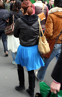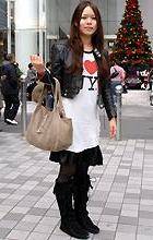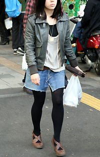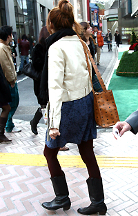 ストリートモード系に多いのがデニムスカートとレザーブルゾンの...