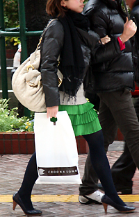 グリーンのスカートを強調した着こなし。モノトーンコーディネー...