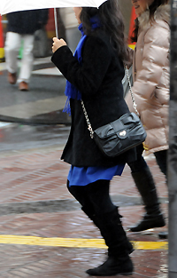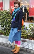 スカートとマフラーを青で統一。無地で色を前面に押し出したコー...