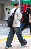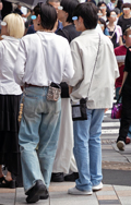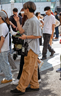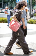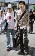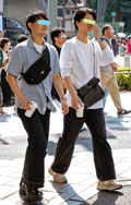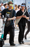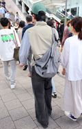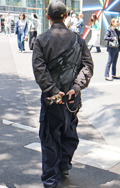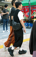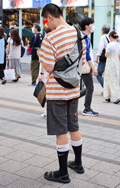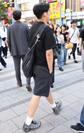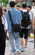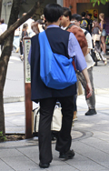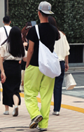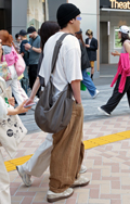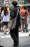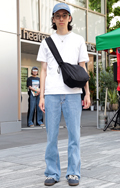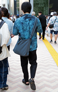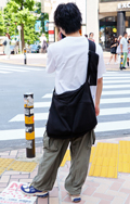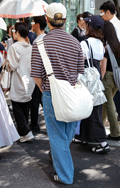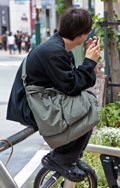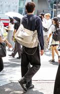 バッグを肩からたすき状に斜めがけしている男性すべて。バッグのサイズや色、素材、ストラップの長さや数は問わない。