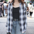バギーパンツが好きで、合わせるのにメンズライクなものがいいと思い、このチェック柄シャツを選びました。パートナーの服をよく借ります。トップス、アクセサリー、小物を借りることが多いです。