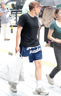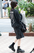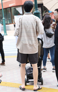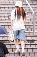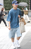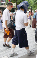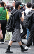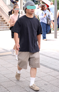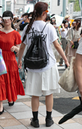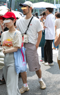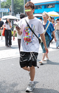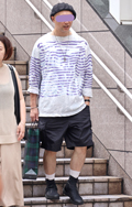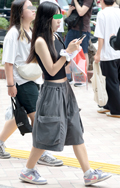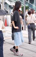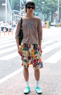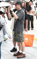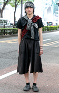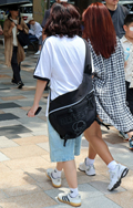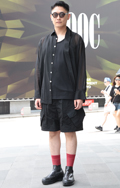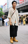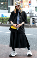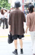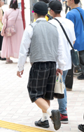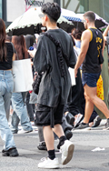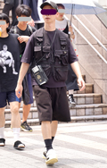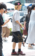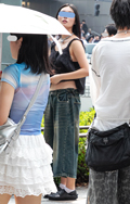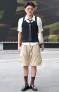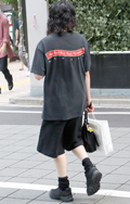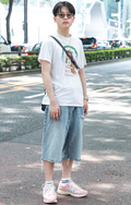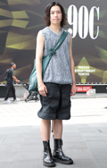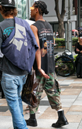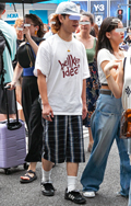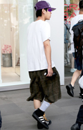 ■ズームアップアイテム定義バギー=だぶだぶしたの意味。ヒップから裾にかけて極端に太いシルエットで、膝とくるぶしの中間よりも短い丈のパンツを着用する男女すべて。
