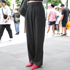 このトップスを選んだのはダボっとしたものがダル着っぽくなって似合わないからスタイルよく見えるように。ダボっとしたものはお仕事に行く時だけ。黒が一番落ち着きます。カラーTシャツとか買ったことないくらい黒ばっかり着ていて、黒にワンポイント色を入れるのが好き。カラーは挑戦してみようと思っています。いろんなジャンルの服を着たいので試してみたいです。