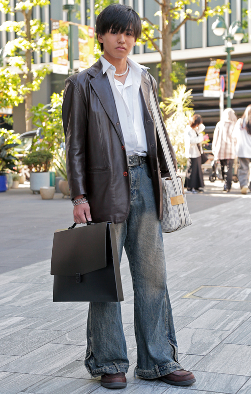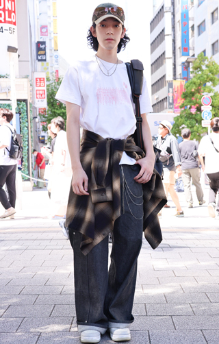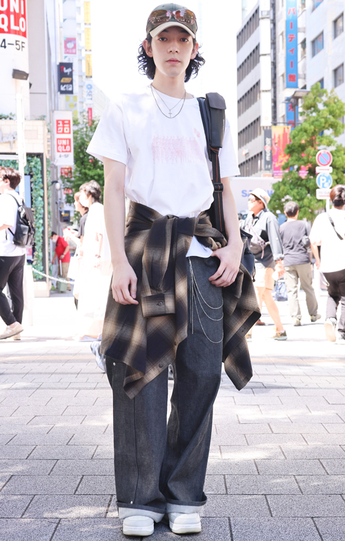 デニム=インディゴで染めたタテ糸と、染色をしていない白い糸のヨコ糸を使用した肉厚の綾織り生地のパンツのうち、太もも部分や膝、裾と着用者の身体に空間が見られる太いシルエットのものを着用している男女全て。色は問わないが、丈はフルレングスとする。
