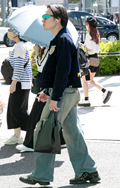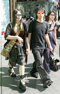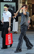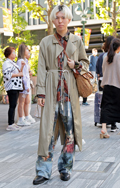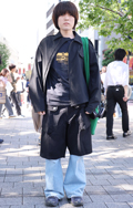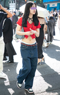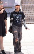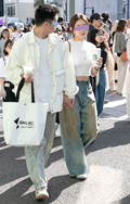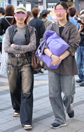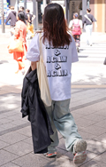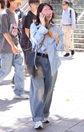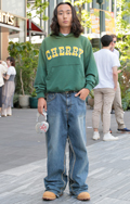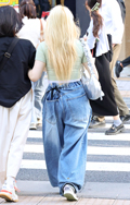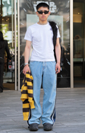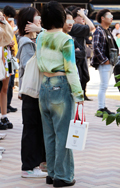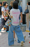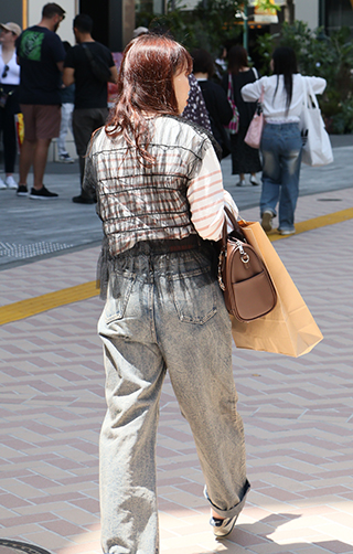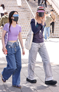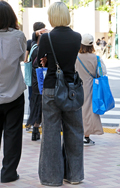 デニム=インディゴで染めたタテ糸と、染色をしていない白い糸のヨコ糸を使用した肉厚の綾織り生地のパンツのうち、太もも部分や膝、裾と着用者の身体に空間が見られる太いシルエットのものを着用している男女全て。色は問わないが、丈はフルレングスとする。