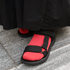 サンダルに汗がつくのがいやで靴下を履きました。黒のスカートがかわいいので他をスポーティーにして、全体的にモノトーンになったので、街中で見て以前からいいなと思っていた靴下に差し色を入れるスタイリングにしました。赤を選んだ理由は持っている色の中で一番パキっとするからです。