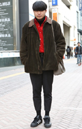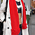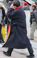コートの襟元から赤いジップアップのトラックジャケットを覗かせ...