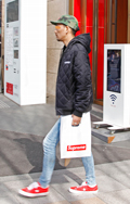 NIKEのビッグスウォッシュの赤を着用した男性。スタンスミス...