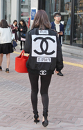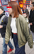 シャネルのパロディのMA-1にピンヒールのパンプスを合わせた...