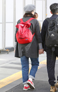 フレンチシックな着こなしに赤のリュックとスニーカーでガーリー...