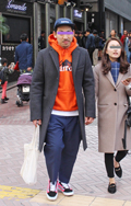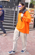 こちらもインパクト大なオレンジのパンツ。全身のカラーバランス...
