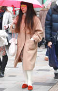 白タイツに赤のフラットシューズを合わせたガーリーなコーディネ...
