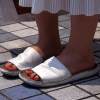 かかと部分が抜けたスリッパタイプのローファーを素足ではく人が...