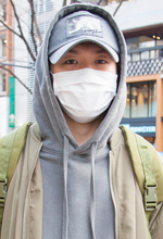 フードをかぶるとシルエットがいい感じになる。足を細く見せられます。かぶらないと男子トイレのシルエットのように見えちゃいます。韓国人でフードをかぶっている人がいて、それを真似しました。韓国を好きになったのは中学2年生くらいからで、きっかけはK-POPです。そこから服にも興味を持ちました。2年前くらいから料理、ブランド、言語に興味を持ちました。いまは韓国料理、韓国語を勉強しています。普段から韓国人っぽいスタイルを意識しています。下は細めのズボンで上はオーバーサイズのアウター、パーカー+レイヤードにしています。オーバーサイズのトップス、細身のボトムスでVシルエットに見せたいです。帽子にフードを重ねたのも、韓国人っぽさを出したかった。韓国人がやっているのをよく見るので。