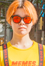 サングラスはジェントルモンスターのもの。韓国のアイドルが好きで、G-DRAGONが付けているブランドだと知って、ひとつぐらい欲しいなと思って買いました。今日はサスペンダーと靴下、サングラスが赤黒になるように揃えました。Tシャツのロゴも赤だったし。